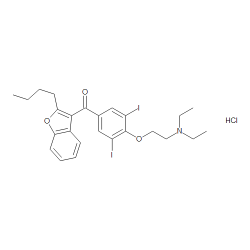 Synonyms: Amiodarone Hydrochloride, (2-Butyl-3-benzofuranyl)[4-[2-(diethylamino)ethoxy]-3,5-diiodophenyl]methanone hydrochloride, 2-Butyl-3-benzofuranyl 4-[2-(diethylamino)ethoxy]-3,5-diiodophenyl ketone hydrochloride, Amiodar, Amiodarone hydrochloride, Amiodaronum hydrochloride, Ancoron, Angiodarona, Atlansil, Cordarex, Cordarone, Cordarone X, L 3428, L 3428-Labaz, Miocard, Miodaron, Ortacrone, Pacerone, Ritmocardyl, Rythmarone, SKF 33134A, Trangorex