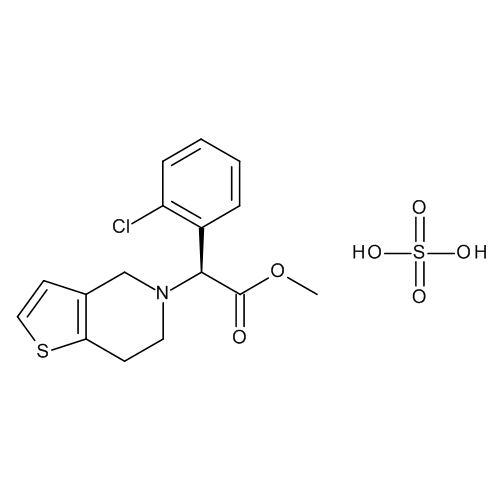 Synonyms: Clopidogrel Hydrogen Sulfate, (S)-(+)-Methyl (2-chlorophenyl)(6,7-dihydro-4H-thieno[3,2-c]pyrid-5-yl)acetate bisulfate, (S)-(+)-Methyl 2-(2-chlorophenyl)-2-(6,7-dihydro-4H-thieno[3,2-c]pyridin-5-yl)acetate hydrogen sulfate, Clopidogrel bisulfate, Clopidogrel hemisulfate, Clopidogrel hydrogen sulfate, Iscover, Methyl (S)-(4,5,6,7-tetrahydrothieno[3,2-c]pyridin-5-yl)(2-chlorophenyl)ethanoate hydrogen sulfate, Plavix, SR 25990C, (alphaS)-alpha-(2-Chlorophenyl)-6,7-dihydrothieno[3,2-c]pyridine-5(4H)-acetic acid methyl ester sulfate (1:1), (S)-alpha-(2-Chlorophenyl)-6,7-dihydrothieno[3,2-c]pyridine-5(4H)-acetic acid methyl ester sulfate (1:1)