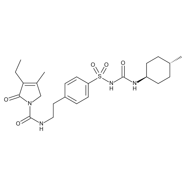 Synonyms: Glimepiride, 3-Ethyl-2,5-dihydro-4-methyl-N-[2-[4-[[[[(trans-4-methylcyclohexyl)amino]carbonyl]amino]sulfonyl]phenyl]ethyl] 2-oxo-1H-pyrrole-1-carboxamide, Amaryl, Glimperide, HOE 490, trans-3-Ethyl-2,5-dihydro-4-methyl-N-[2-[4-[[[[(4-methylcyclohexyl)amino]carbonyl]amino]sulfonyl]phenyl]ethyl] 2-oxo-1H-pyrrole-1-carboxamide