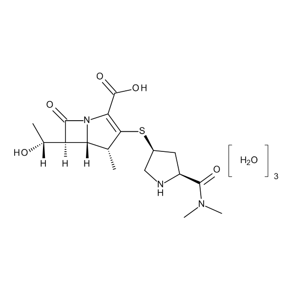 Synonyms: (4R,5S,6S)-3-[[(3S,5S)-5-[(Dimethylamino)carbonyl]-3-pyrrolidinyl]thio]-6-[(1R)-1-hydroxyethyl]-4-methyl-7-oxo-1-azabicyclo[3.2.0]hept-2-ene-2-carboxylic Acid Trihydrate, (4R,5S,6S)-3-[[(3S,5S)-5-[(dimethylamino)carbonyl]-3-pyrrolidinyl]thio]-6-[(1R)-1-hydroxyethyl]-4-methyl-7-oxo-1-azabicyclo[3.2.0]hept-2-ene-2-carboxylic Acid Trihydrate,Meropenem trihydrate, (4R,5S,6S)-3-[[(3S,5S)-5-[(Dimethylamino)carbonyl]pyrrolidin-3-yl]sulfanyl]-6-[(1R)-1-hydroxyethyl]-4-methyl-7-oxo-1-azabicyclo[3.2.0]hept-2-ene-2-carboxylic acid trihydrate, [4R-[3(3S*,5S*),4a,5ß,6ß(R*)]]-3-[[5-[(Dimethylamino)carbonyl]-3-pyrrolidinyl]thio]-6-(1-hydroxyethyl)-4-methyl-7-oxo-1-azabicyclo[3.2.0]hept-2-ene-2-carboxylic Acid Trihydrate