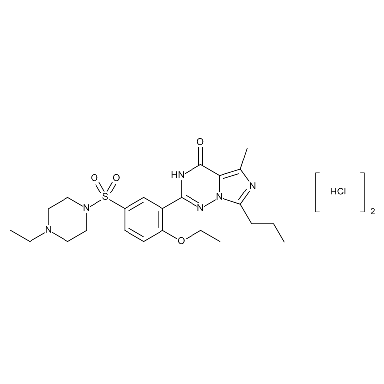 Synonyms: Imidazo[5,1-f][1,2,4]triazin-4(1H)-one, 2-[2-ethoxy-5-[(4-ethyl-1-piperazinyl)sulfonyl]phenyl]-5-methyl-7-propyl-, hydrochloride (1:2), Piperazine, 1-[[3-(1,4-dihydro-5-methyl-4-oxo-7-propylimidazo[5,1-f][1,2,4]triazin-2-yl)-4-ethoxyphenyl]sulfonyl]-4-ethyl-, dihydrochloride (9CI), Vardenafil dihydrochloride